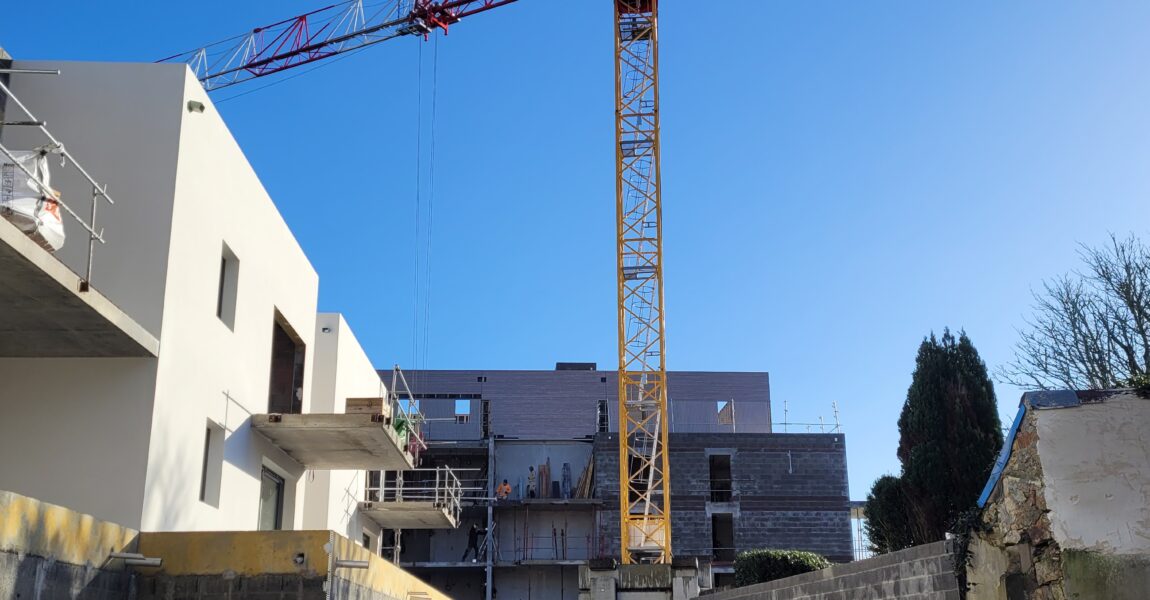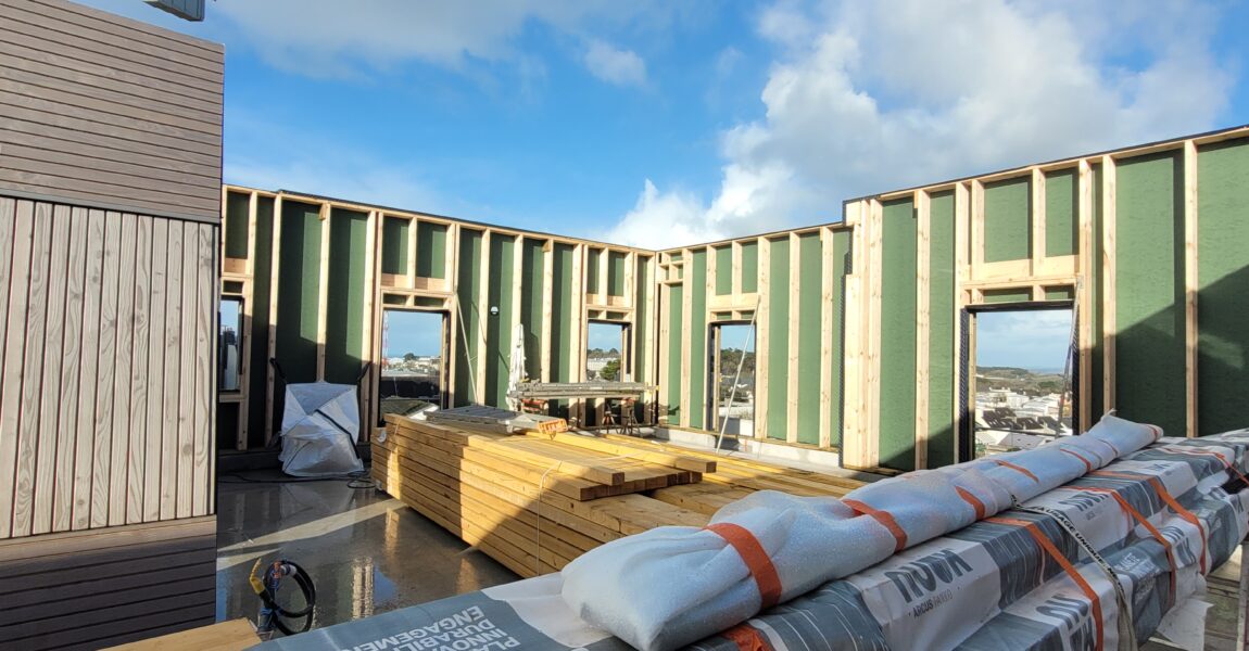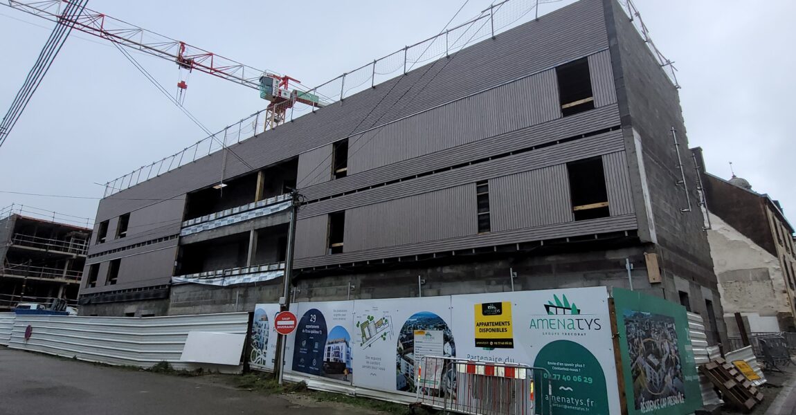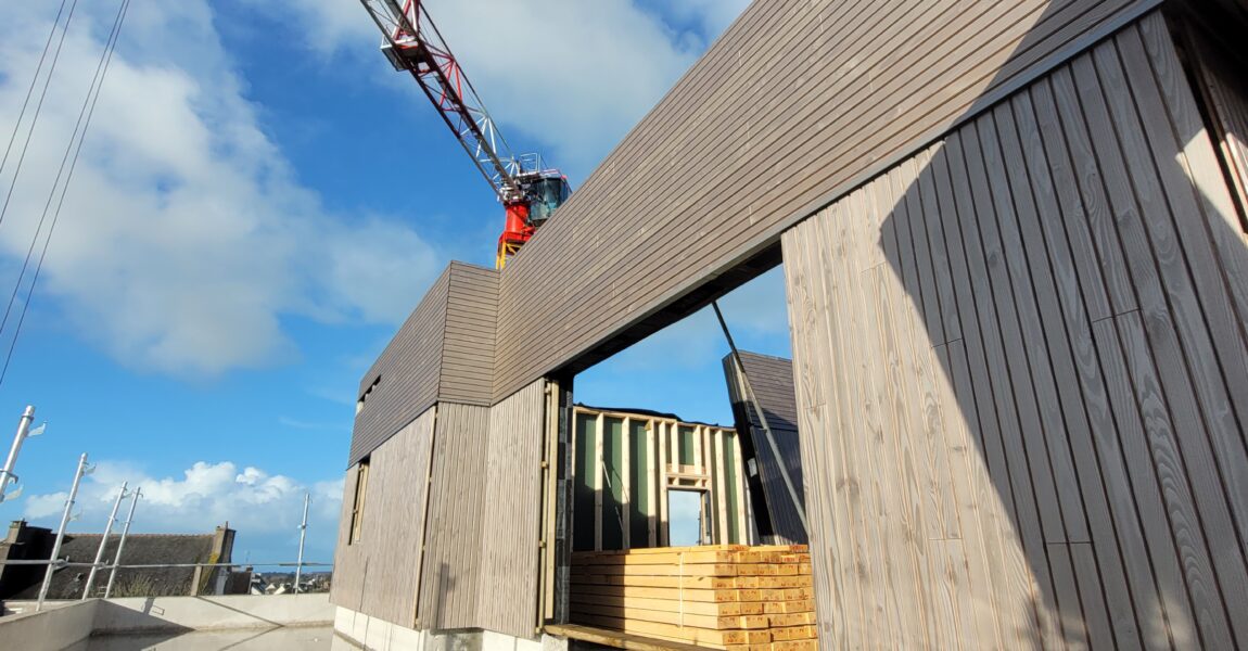 Amenatys poursuit son engagement en faveur d’un habitat durable avec son programme immobilier à Crozon (29) : Cap Presqu’île. Une étape majeure vient d’être franchie avec la pose des murs à ossature bois.
